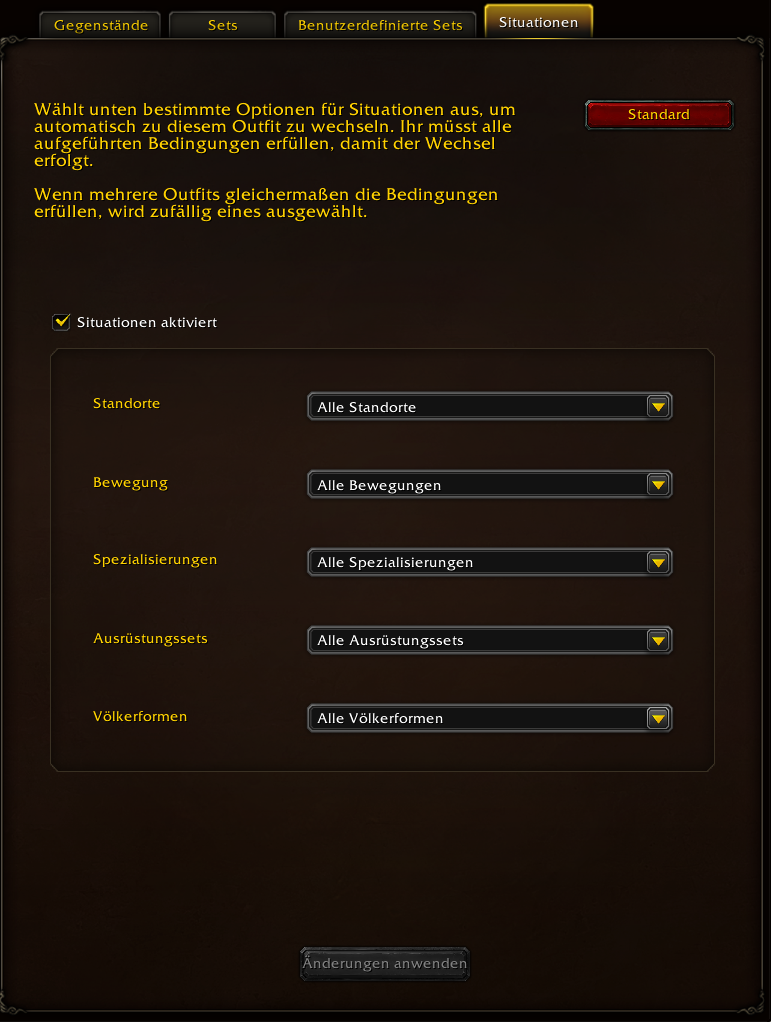 Zudem habt Ihr die Möglichkeit, durch einen Rechtsklick auf ein Outfit dieses vorübergehend dauerhaft festzulegen, damit es nicht durch eingestellte „Situationen“ überschrieben wird.