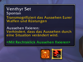 Eine weitere spannende Funktion kann ebenfalls mit dem neuen System genutzt werden. Habt Ihr ein Outfit gespeichert, dann könnt Ihr dieses Outfit auch einfach in Eure Aktionsleisten ziehen und dann immer und überall einfach mit einem Klick das Aussehen wechseln, ohne das Yak zu benötigen oder zu einem Transmog-NPC gehen zu müssen.