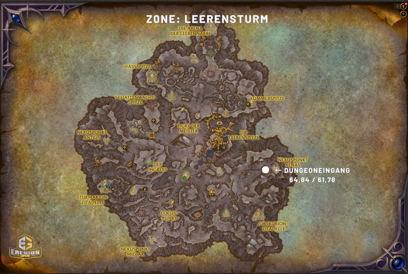 Dort begibst du dich jetzt in den Bereich von den Koordinaten 64,84 / 61,78 – dort findest du dann das Eingangsportal zum Dungeon.