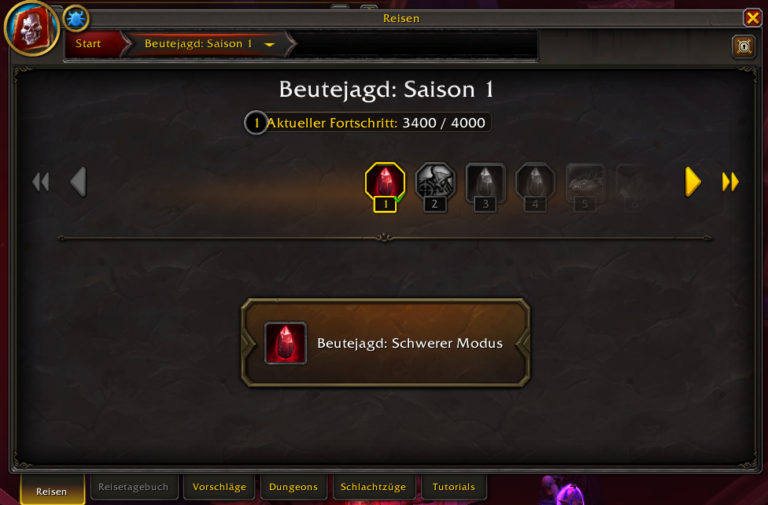 In Eurem Abenteuerführer findet Ihr unter dem Tab „Reisen“ im Abschnitt „Begegnungen“ auch die Beutejagd: Saison 1. Insgesamt 10 Ruhmstufen könnt Ihr dort mit Eurer Kriegsmeute aufsteigen und dadurch verschiedene Belohnungen in Form von Reittieren, Haustieren und Verbesserungen bei der Beutejagd freischalten.