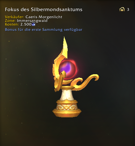 - Dekoration aus Silbermond V: Ihr könnt einen Fokus des Silbermondsankturms und eine Statue eines andächtigen Sin’dorei von Caeris Morgenlicht in Saltherils Hafen im Immersangwald kaufen.