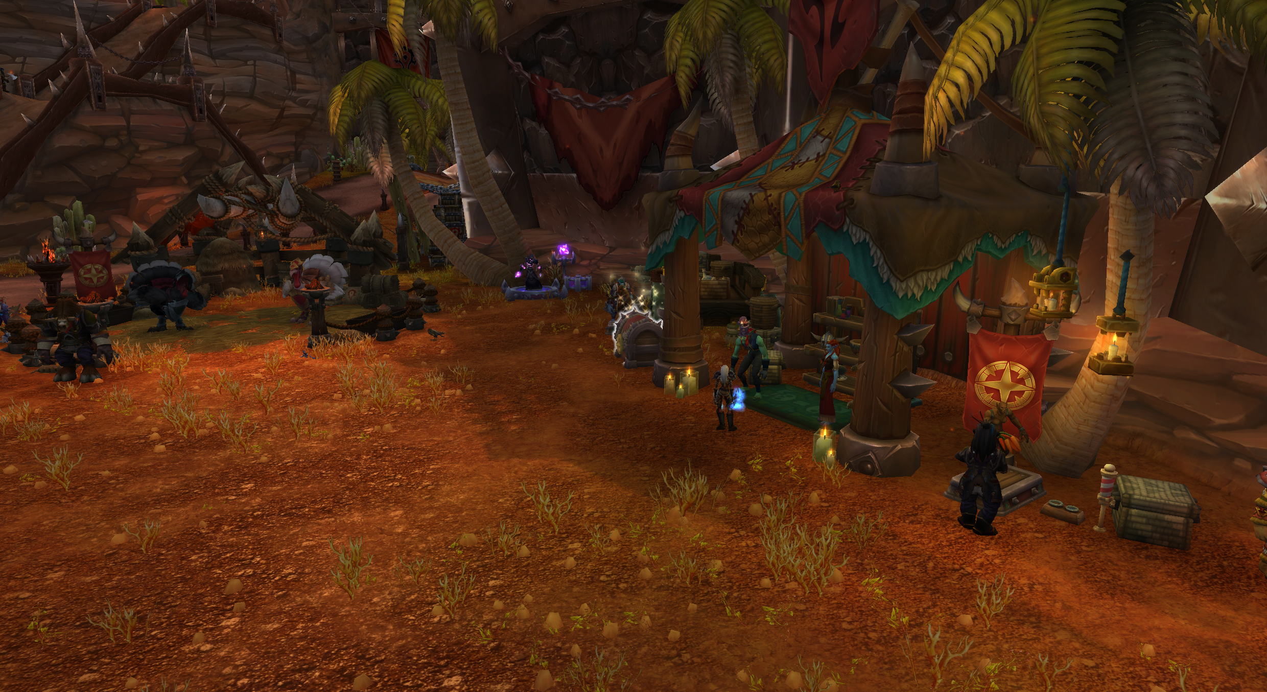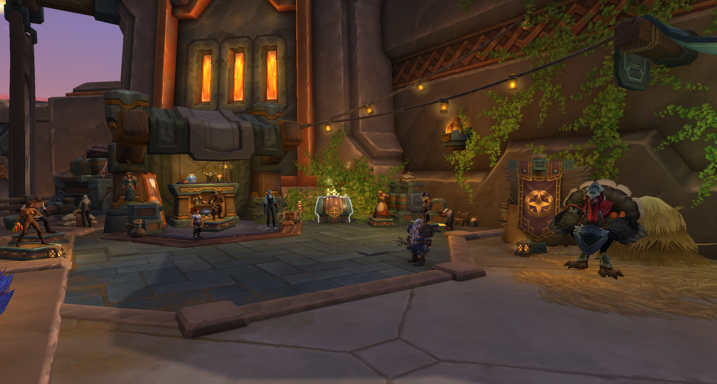Der Handelsposten der Horde steht direkt am Zugang zum Tal der Stärke. Auch hier findest du eine hölzerne Hütte, ein paar Kisten und zwei Händler mit ihrer Auswahl an Monatsangeboten. Die Horde-Version ist in ihrer Optik etwas rauer gehalten und passt gut zum Orgrimmar-Stil.