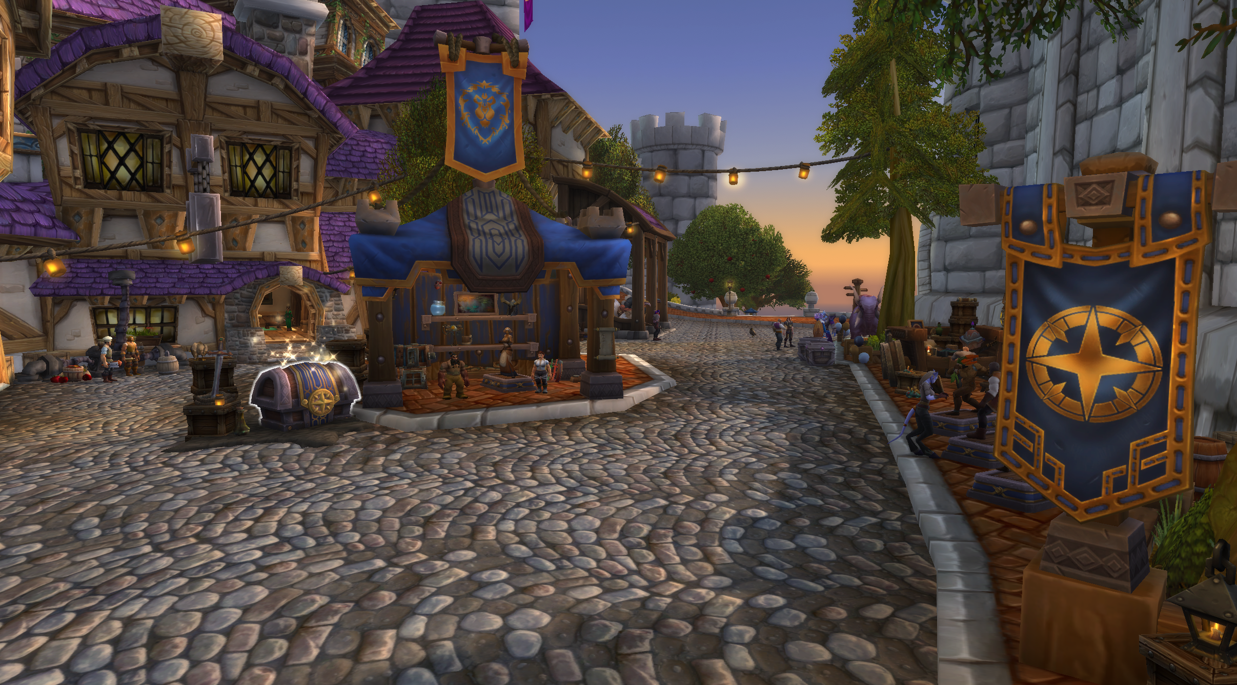 Der Handelsposten der Allianz steht am Eingang zum Magierviertel in Sturmwind. Er ist leicht zu erkennen: Zwei Händler, eine kleine Holzhütte, Fässer, Stoffbanner und ein deutlich sichtbares Schild kennzeichnen den Platz. Häufig stehen dort viele Spieler, die sich die neuesten Angebote anschauen.