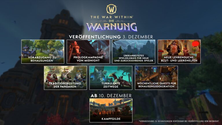 In dieser Übersicht gehen wir auf alle wesentlichen Inhalte und Neuerungen sowie Anpassungen ein. Erfahrt mehr über die neuen Teile der Kampagne, den Vorabzugang zu Spielerbehausungen, der Rückkehr der turbulenten Zeitwege sowie der Kampfgilde und weitere System Anpassungen und Neuerungen.