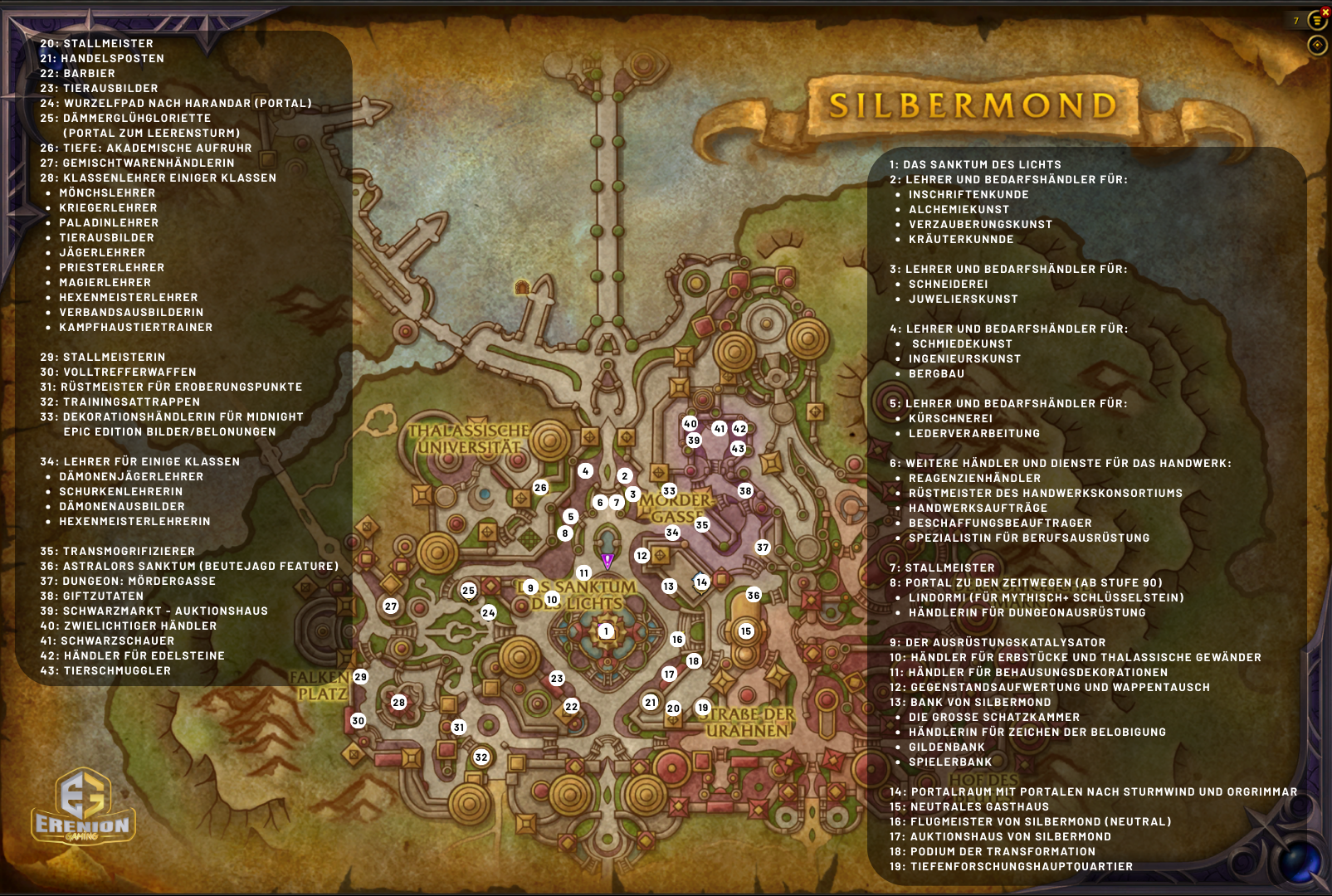 Midnight steht kurz vor der Tür und heute haben wir für Euch den großen Stadplan für Silbermond, der neuen Hauptstadt in der kommenden Erweiterung. Wir haben Euch in dieser Karte die unserer Meinung nach wichtigsten Punkte und Orte aufgelistet und haben uns dabei lediglich auf den neutralen Bereich der Stadt, also wo Horde und Allianzspieler sich aufhalten können, konzentriert.